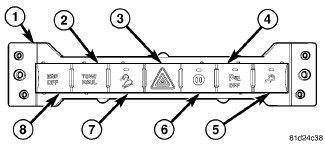 The upper instrument panel switch pod (1) is located just above the heater and air conditioner controls in the center stack area of the instrument panel. This switch is available in multiple configurations, which vary depending upon the equipment in the vehicle. However, every available configuration includes the hazard warning push button switch. The upper pod may include the following switches: