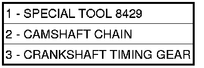 7. Position the secondary chain (2) onto the camshaft drive gear, making sure one marked chain link is on either side of the V6 mark (1) on the gear then using the Camshaft Holder 8428, position the gear onto the camshaft.