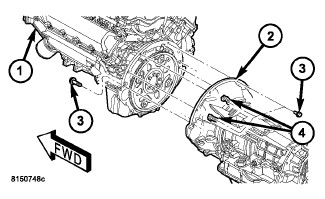 2. Install the transmission bellhousing to engine mounting bolts (3). Tighten the bolts to 41 Nm (30ft. lbs.)