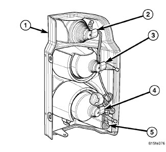 NOTE: The rear lamp unit (1) contains four bulbs. For domestic market vehicles they are: backup (2), park/stop (3), park/turn signal (4) and rear side marker (5). For export market vehicles they are: turn signal (2), park/stop (3), park (4) and backup (5). The service procedures for each bulb are the same, only the bulb sizes and types may differ.