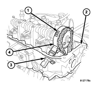 The Camshaft Position Sensor (CMP) sensor on the 3.7L (3) contains a hall effect device referred to as a sync signal generator. A rotating target wheel (tonewheel) (4) for the CMP is located at the front of the camshaft for the right cylinder head (2). This sync signal generator detects notches (1) located on a tonewheel. As the tonewheel rotates, the notches pass through the sync signal generator. The signal from the CMP sensor is used in conjunction with the Crankshaft Position Sensor (CKP) to differentiate between fuel injection and spark events. It is also used to synchronize the fuel injectors with their respective cylinders.