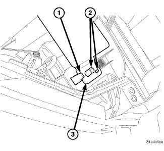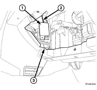 The control module (1) is located behind and to the left side of the glove box opening (3). The module electrical connector plugs into the WIN attached to the ignition switch located near the right side of the steering column.