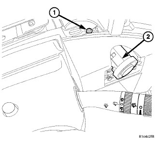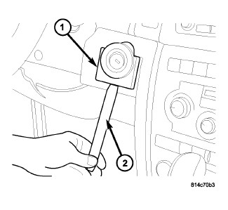 4. Use a plastic trim removal stick (2) to remove ignition switch bezel (1). Bezel snaps on.