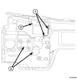 1. Locate the transmission control module on the dash panel, under the dash panel silencer pad (2), just to the right of the steering column.