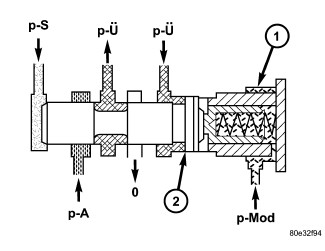 The regulating valve pressure is regulated at the regulating valve pressure regulating valve in relation to the working pressure (p-A) up to a maximum pressure of 8 bar (116 psi). It supplies the modulating pressure regulating solenoid valve, the shift pressure regulating solenoid valve and the shift valve pressure regulating valve.