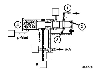 The working pressure (p-A) is regulated at the working pressure regulating valve (4) in relation to load (modulating pressure, p-Mod) and gear (K1 or K2 pressure) (1). The spring in the working pressure regulating valve sets a minimum pressure level (basic pressure).