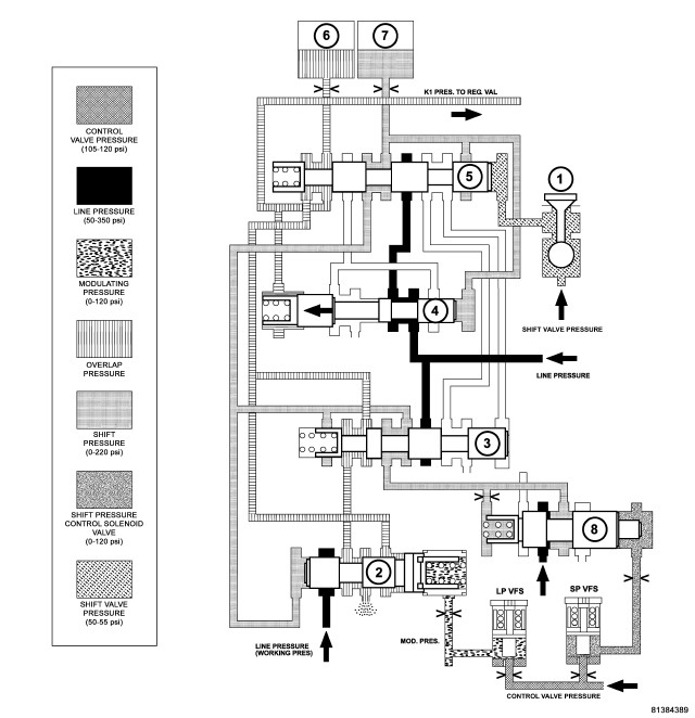 - The modulating pressure and shift pressures rise to the maximum levels.