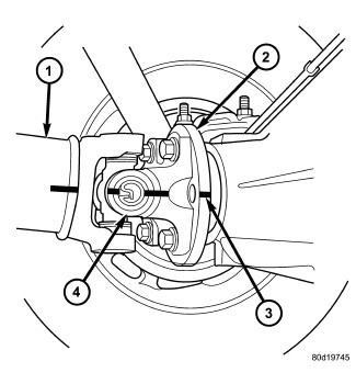 2. Mark a reference line across the axle flange (3) and propeller shaft flange (4).