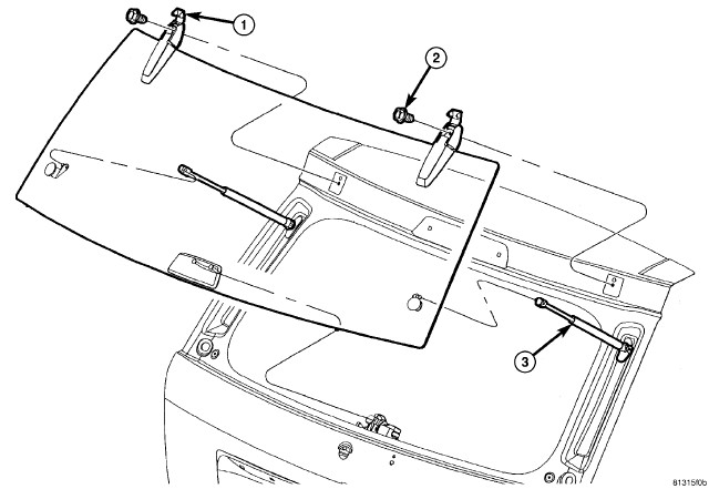 2. Install hinge bolts (2). Center liftgate. Tighten hinge bolts to 7 Nm (60 in. lbs.).