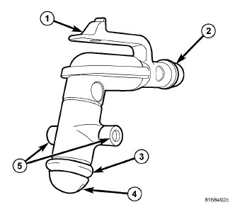 The domed outer surface of the washer nozzle is visible on the lower exterior surface of the CHMSL, and a rubber O-ring (3) seals the nozzle to the lamp lens. The nozzle orifice is oriented downward towards the liftgate glass. The washer plumbing fitting (2) is concealed between the liftgate outer and inner panels.