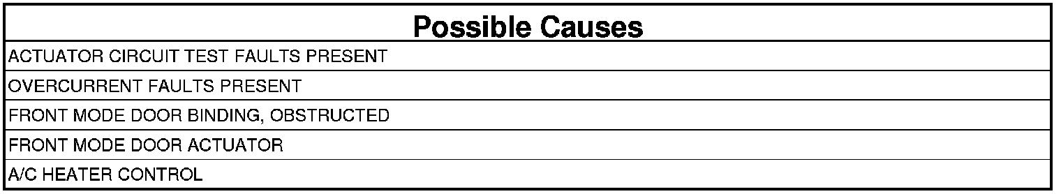 The purpose of actuator calibration is to determine the total span of door travel between physical stops. To calibrate the actuator, the A/C Heater Control first moves the door to its soft stop, and then counts the number of pulses it takes to move the door to its other stop. An expected range of span is stored in the control's memory. If the A/C Heater Control detects too few commutator pulses when calibrating the front mode door, this DTC will set.