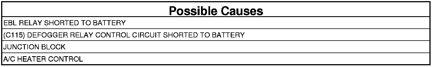 - Repair the (C115) Defogger Relay Control circuit for a short to battery.