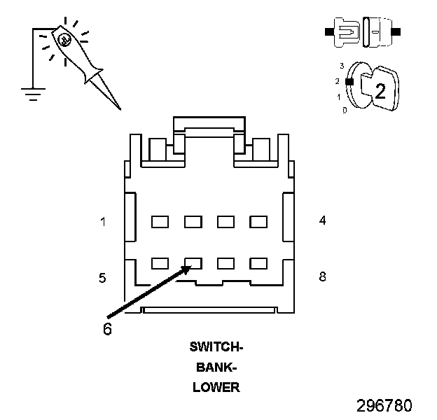 2. Using a 12-volt test light connected to 12-volts, check the (Z18) Ground circuit at the Lower Switch Bank harness connector.