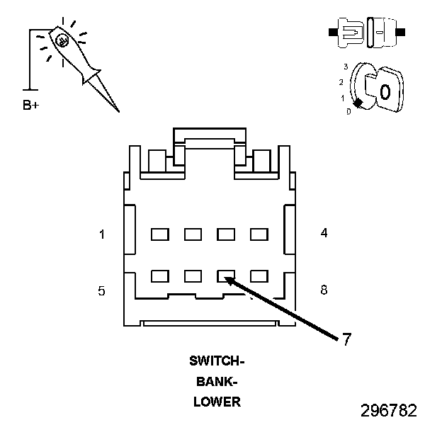 2. Using a 12-volt test light connected to ground, check the (A108) Fused B+ circuit at the Lower Switch Bank harness connector.