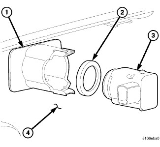 NOTE: The park assist sensors (3) and the sensor spacers (2) are each available for separate service replacement. The sensor brackets (1) are bonded and integral to the back side of the front bumper fascia (4).
