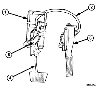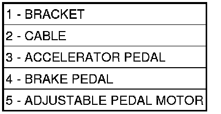Change of pedal position is accomplished by means of a motor driven screw (5). Operating the adjustable pedal switch activates the pedal drive motor (5). The pedal drive motor turns a screw that changes the position of the brake (4) and accelerator pedals (3). The pedal can be moved rearward (closer to the driver) or forward (away from driver). The brake pedal is moved on its drive screw to a position where the driver feels most comfortable.