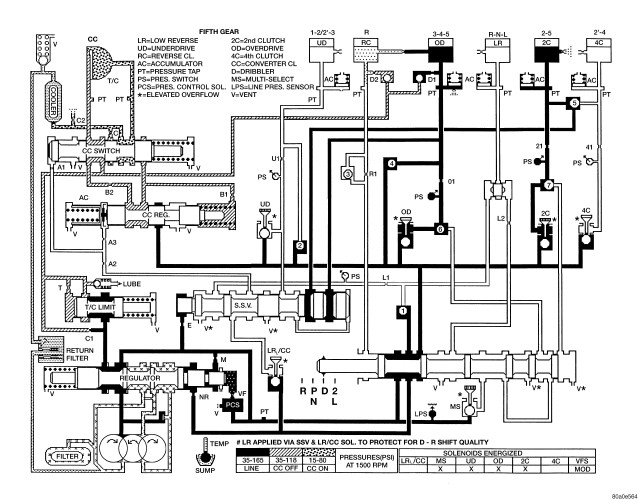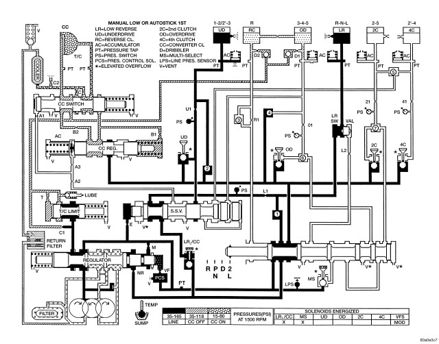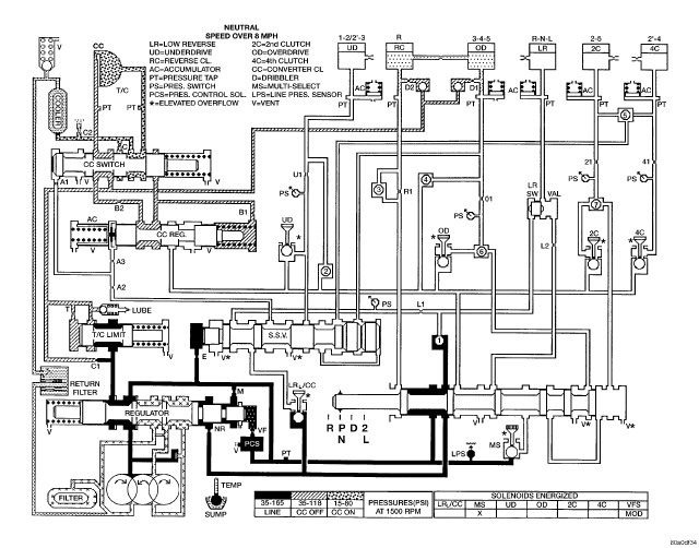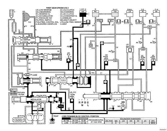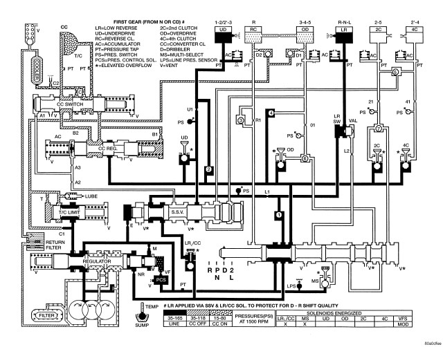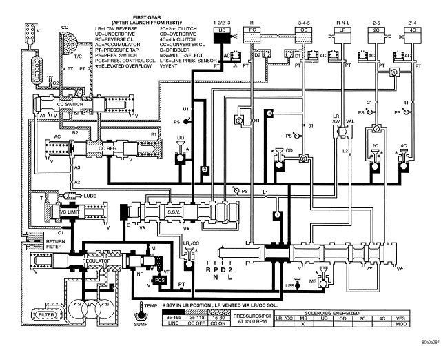 HYDRAULIC FLOW IN FIRST GEAR (FROM N OR OD)