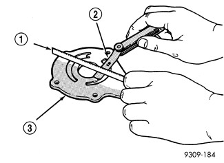 2. Lay a straight edge across the pump cover surface (3). If a 0.025 mm (0.001 in.) feeler gauge (2) can be inserted between the cover and the straight edge the oil pump assembly should be replaced.