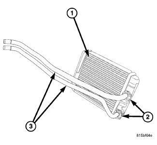 The rear heater core (1) is located in the rear HVAC housing, behind the right interior quarter trim panel. The rear heater core is a heat exchanger made of rows of tubes and fins. The heater core tubes (3) are attached to the heater core by metal retaining clamps (2) and rubber O-ring seals