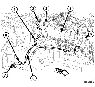 The A/C liquid line (1) is the refrigerant line that carries refrigerant from the receiver/drier (5) to the A/C expansion valve (2). The liquid line is retained to the A/C expansion valve by a tapping plate (3) which is integral to the A/C suction line (4) . A/C Liquid Line - Description Models equipped with the rear heating-A/C system include an extension tube (6) that connect the liquid line to the underbody liquid line (7) by use of a tapping block (8).