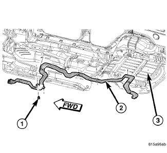 3. Install the two screws (1) that secure the underbody line assembly to the underbody, near the center of the vehicle. Tighten the screws securely.