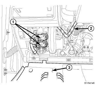 The molded plastic JB housing is secured with four screws and two snap retainers to the JB mounting bracket behind the instrument panel steering column opening cover (3). The steering column opening cover can be pulled downward to disengage the latches and provide service access to all of the fuses, relays and wire harness connectors (1) of the JB. Refer to Steering Column Opening Cover in Body for additional service information. Service and Repair