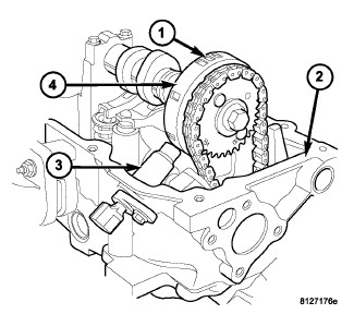 The CMP sensor engine contains a hall effect device called a sync signal generator to generate a fuel sync signal. This sync signal generator detects notches located on a tonewheel. The tonewheel (4) is located at the front of the camshaft for the right cylinder head (2). As the tonewheel rotates, the notches (1) pass through the sync signal generator. The pattern of the notches (viewed counter-clockwise from front of engine) is: 1 notch, 2 notches, 3 notches, 3 notches, 2 notches, 1 notch, 3 notches and 1 notch. The signal from the CMP sensor is used in conjunction with the crankshaft position sensor to differentiate between fuel injection and spark events. It is also used to synchronize the fuel injectors with their respective cylinders.