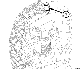 9. Position the EGR valve routing tube into the intake manifold until the EGR valve routing tube flange (1) is flush with the intake manifold.