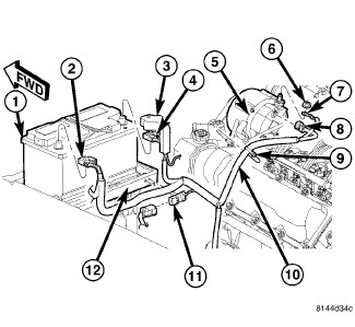 4. Install the battery wire harness retaining clips (7) AND (9) to the engine.