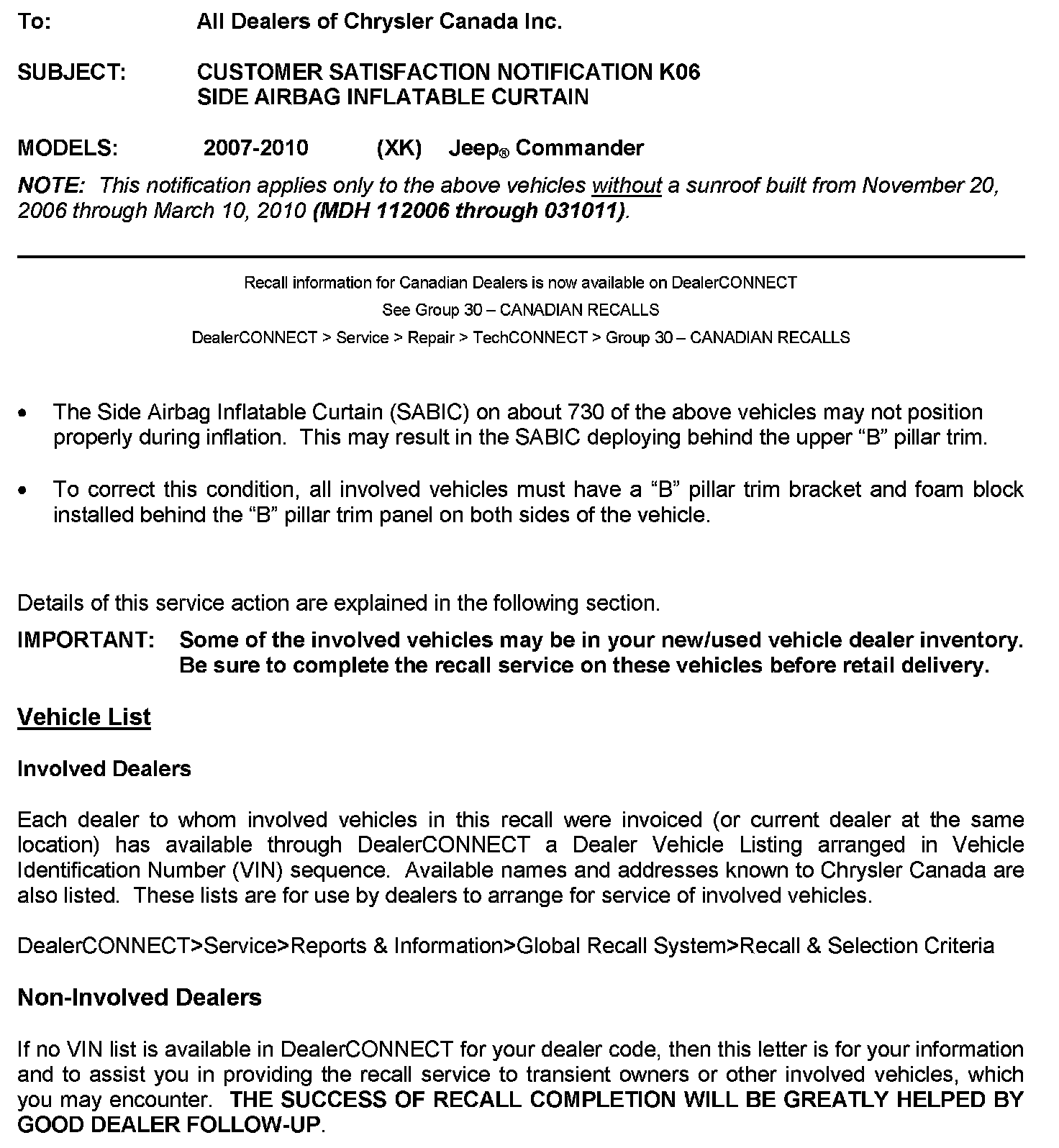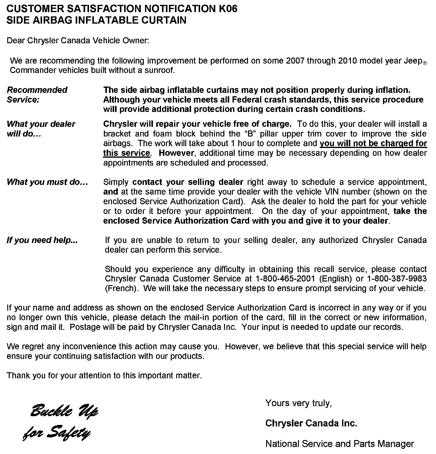 CUSTOMER SATISFACTION NOTIFICATION K06 SIDE AIRBAG INFLATABLE CURTAIN