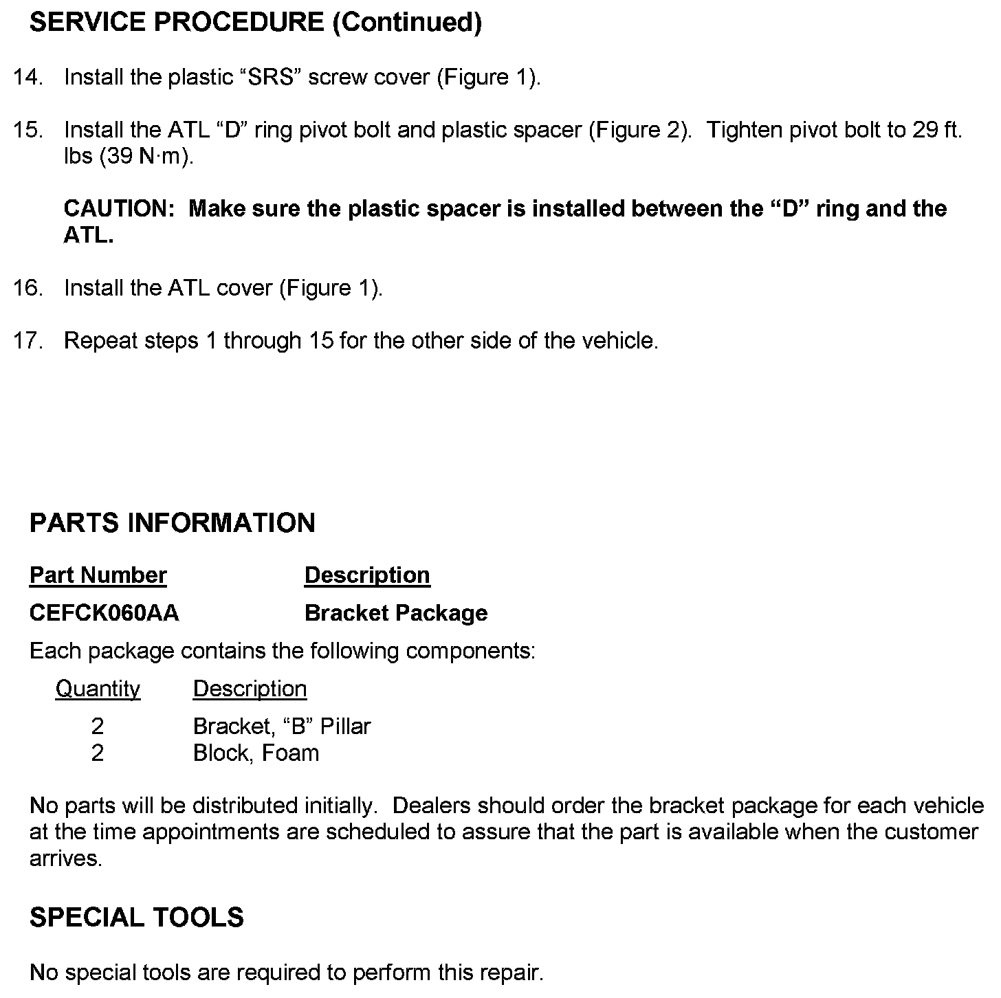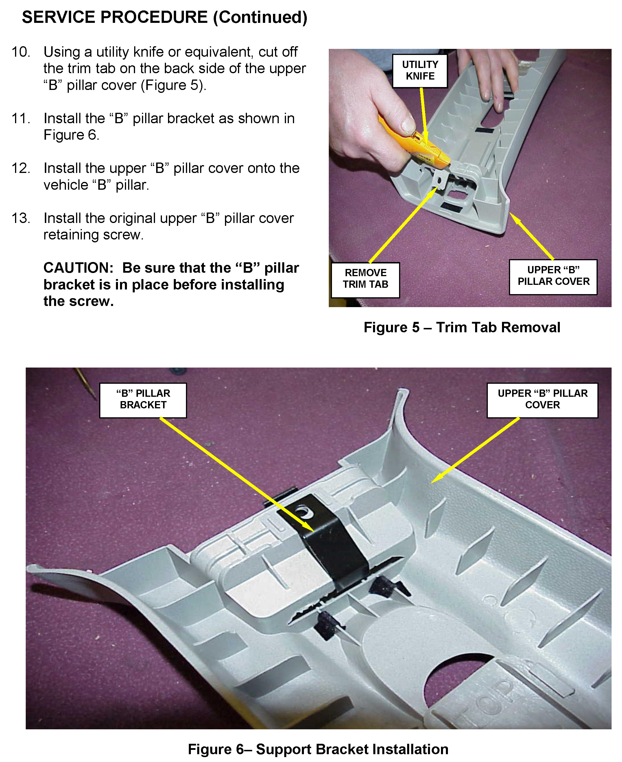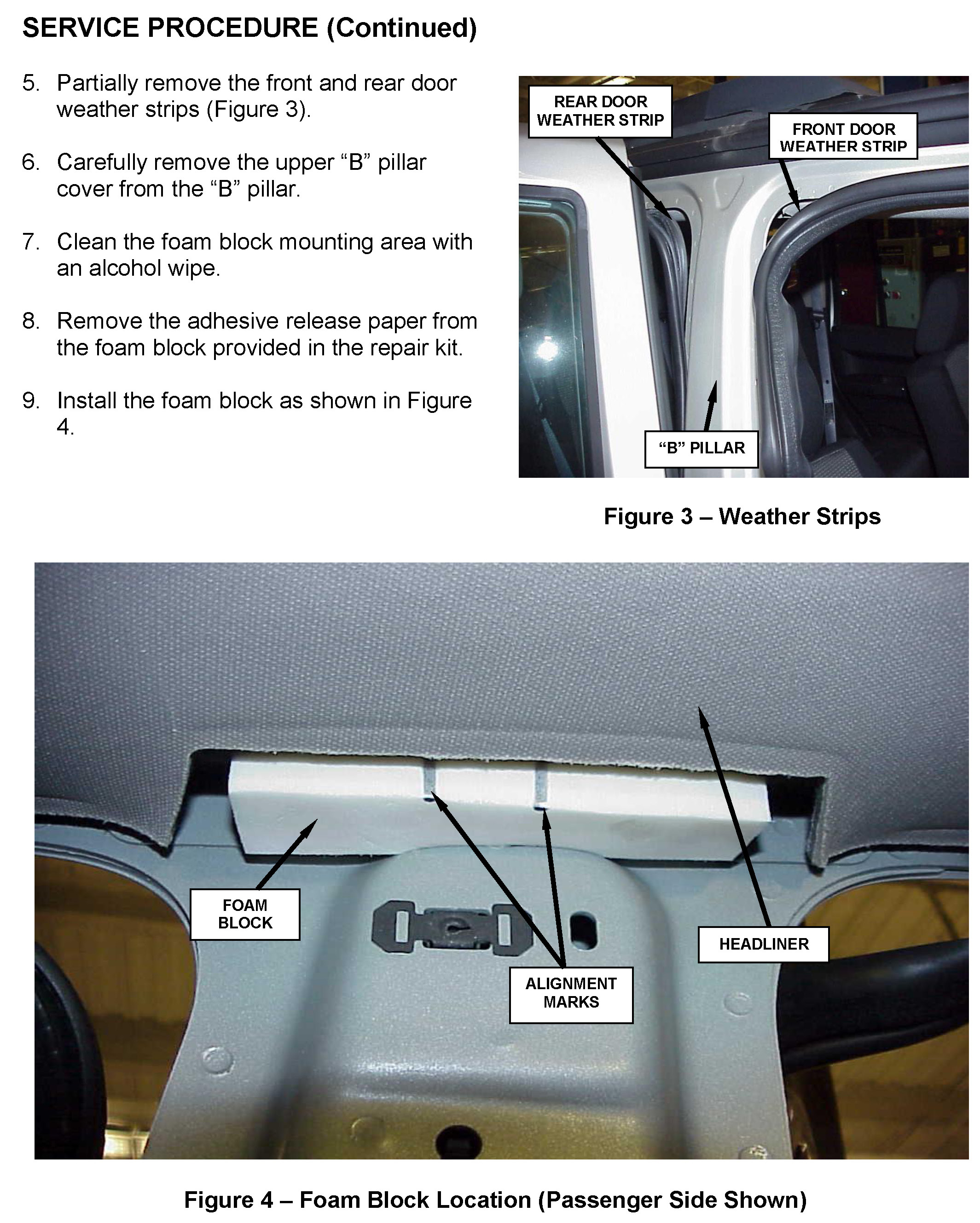 ^ To correct this condition, all involved vehicles must have a "B" pillar trim bracket and foam block installed behind the "B" pillar trim panel on both sides of the vehicle.