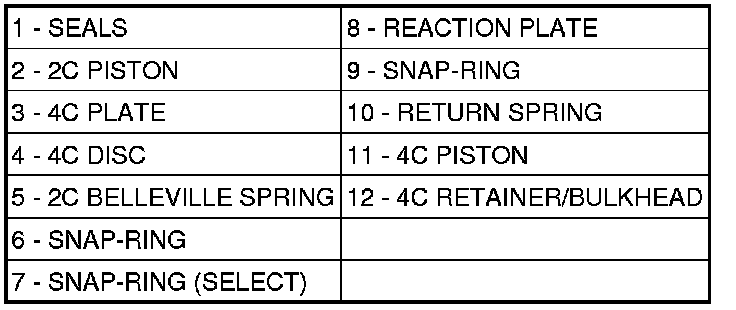 Three hydraulically applied multi-disc clutches are used to hold some planetary geartrain components stationary while the input clutches drive others. The 2C, 4C, and Low/Reverse clutches are considered holding clutches. The 2C and 4C clutches are located in the 4C retainer/bulkhead (12).