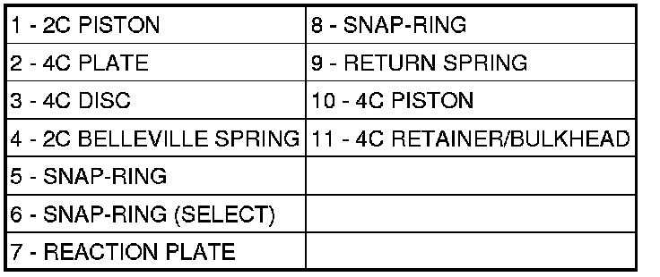 1. Remove the 2C piston Belleville spring snap-ring (5) from the 4C retainer/bulkhead (12).