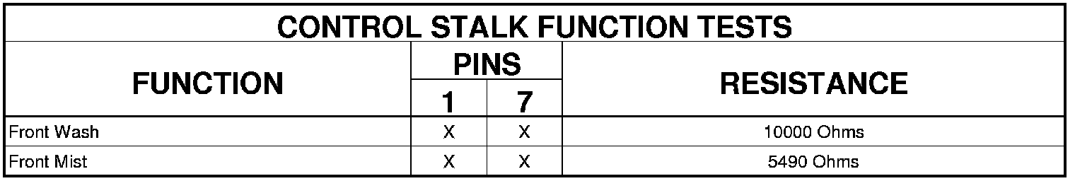 2. Using an ohmmeter, test the resistance between the terminals of the switch as shown in the three Function Tests tables. For all functions except those of the control stalk the values should be either less than 100 ohms (switch CLOSED) or greater than 1 megohm (switch OPEN).
