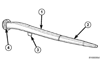 The wiper arm hinge, pivot block and tension spring are all concealed on the underside of the wide end of the arm. A molded plastic wiper arm support (3) is integral to the wiper arm and extends from the lower edge of the arm. The matching wiper blade has two pivot pins that latch into a receptacle concealed within the narrow end of the arm. The rear wiper arm cannot be adjusted or repaired. If damaged or ineffective, the entire wiper arm unit must be replaced.