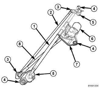 - Linkage - A stamped steel drive link (8) connects the wiper motor crank arm to the passenger side wiper pivot lever arm (3), and a connecting link (2) connects the passenger side pivot lever arm to the driver side pivot lever arm. Each link has a plastic socket-type bushing on each end. The socket-type bushing on each link is snap-fit over a ball stud. There are two ball studs on the passenger side pivot lever arm and one each on the motor crank arm and the driver side pivot lever arm.