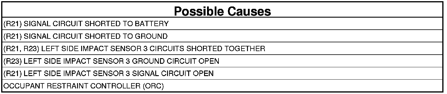 - Repair the (R21) Left Side Impact Sensor 3 Signal circuit for an open or high resistance.