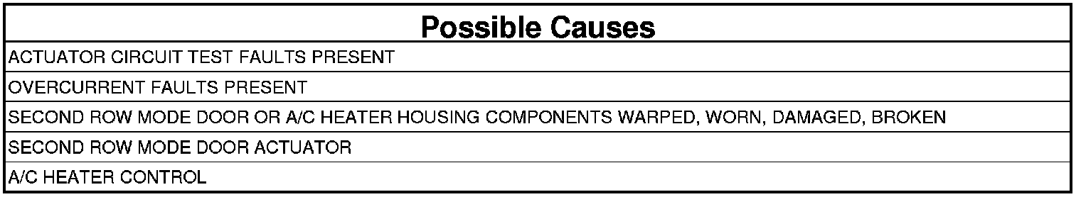 The purpose of actuator calibration is to determine the total span of door travel between physical stops. To calibrate the actuator, the A/C Heater Control first moves the door to its soft stop, and then counts the number of pulses it takes to move the door to its other stop. An expected range of span is stored in the control's memory. If the A/C Heater Control detects too many commutator pulses when calibrating the second row mode door, this DTC will set.
