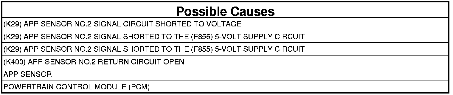 - Repair the short between the (K29) APP Sensor No.2 Signal circuit and the (F856) 5-volt Supply circuit.