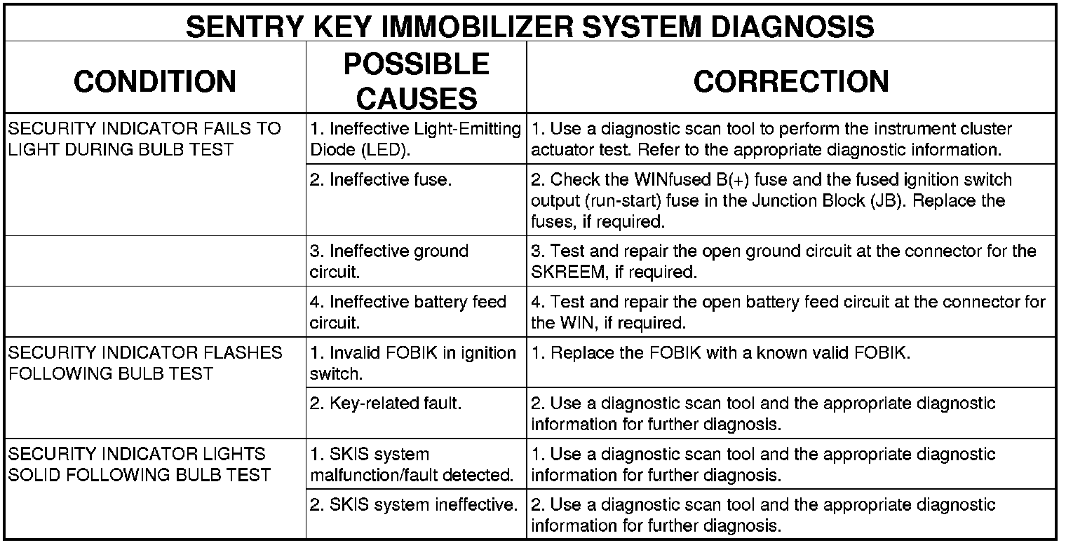 The Vehicle Theft Security System (VTSS) is divided into two basic subsystems: Vehicle Theft Alarm (VTA) and Sentry Key Immobilizer System (SKIS). Following are the recommended procedures for diagnosis of each of these two subsystems.