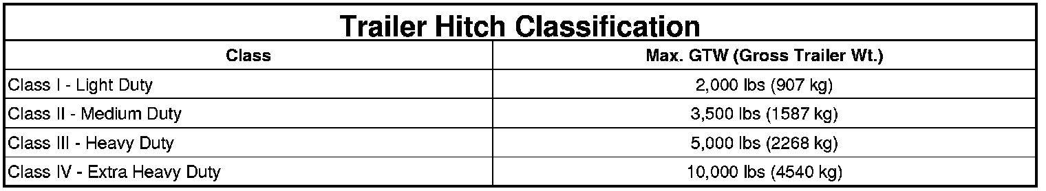 The following chart provides the industry standard for the maximum trailer weight a given trailer hitch class can tow and should be used to assist you in selecting the correct trailer hitch for your intended towing condition. Refer to the Trailer Towing Weights (Maximum Trailer Weight Ratings) chart for the Max. GTW towable for your given drivetrain.