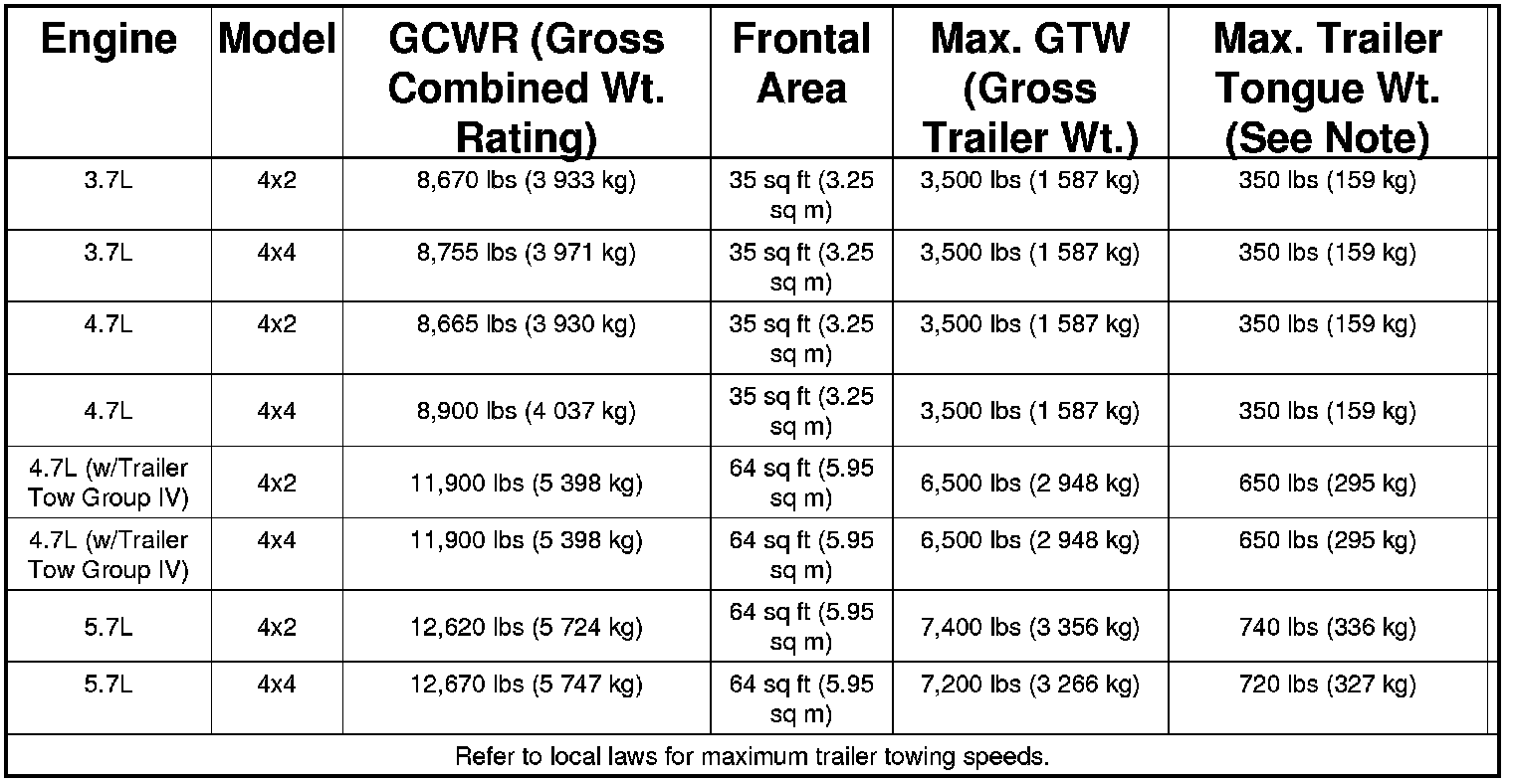 The following chart provides the maximum trailer weight ratings towable for your given drivetrain.