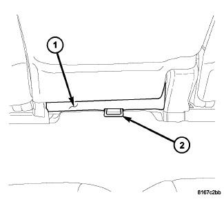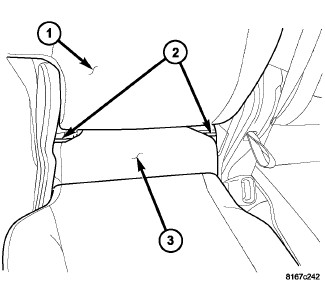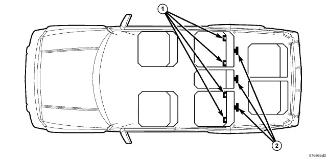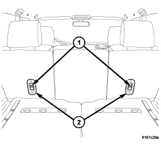 The two outboard upper tether anchors (1) are integral to the second row outboard seat back panels. The outboard anchors are each constructed from short lengths of heavy-gauge steel wire that is securely welded into stamped steel cups that are integral to the seat back panels. There is a separate molded plastic trim bezel (2) located around each of these outboard anchors. These child restraint upper outboard tether anchors cannot be adjusted or repaired and, if ineffective or damaged, they must be replaced as a unit with their respective second row seat back panels.