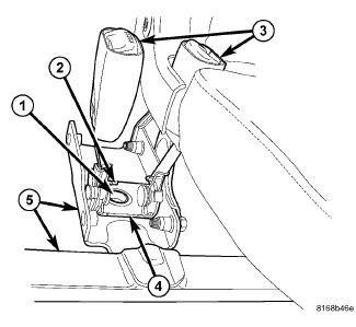 2. Position the third row buckles (3) and anchor plate (4) to the third row seat support bracket (5). Be certain that the anti-rotation notch on the anchor plate is engaged with the tab (2) on the seat support bracket.