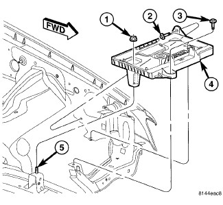 3. Install and tighten the one nut (1) that secures the rear of the battery tray to the stud (5) on the front frame rail. Tighten the nut to 7 Nm (65 in. lbs.).