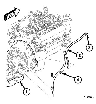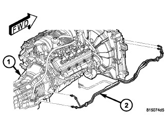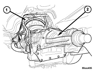 16. Install both the left and right side oil pan to transmission bolts (1), 5.7L only. Torque the bolts to 54 Nm (40 ft. lbs.).