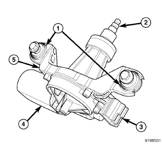 - Bracket (5) - The rear wiper motor bracket consists of a molded plastic mounting plate for the wiper motor that is secured with screws to the wiper motor housing, and through two screws with rubber isolators (1) to the liftgate inner panel.