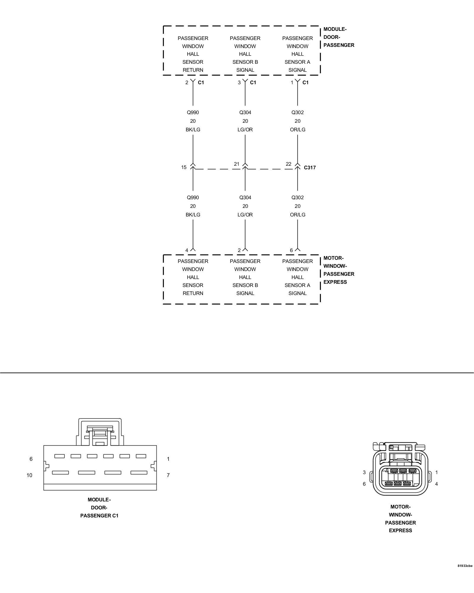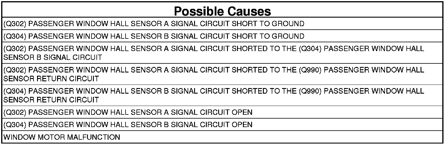 - Repair the (Q302) Passenger Window Hall Sensor A Signal circuit for a short to the (Q990) Passenger Window Hall Sensor Return circuit.