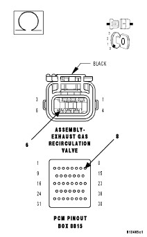 3. Using a Voltmeter, perform a voltage drop test by backprobing the (K35) EGR Control circuit at the EGR Valve Assembly harness connector and probing the appropriate terminal of the PCM Pinout Box 8815. Make sure the Voltmeter leads are connected so that positive polarity is displayed on the Voltmeter.