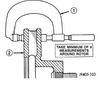 Measure rotor thickness a minimum of six points around the rotor face. Position the micrometer approximately 19 mm (3/4 in.) from the rotor outer circumference for each measurement.